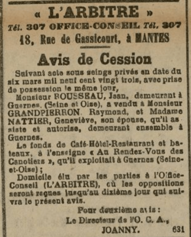 Parution du petit mantais du 10/02/1923 – Avis de cession du 21 /01/1923