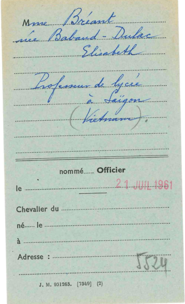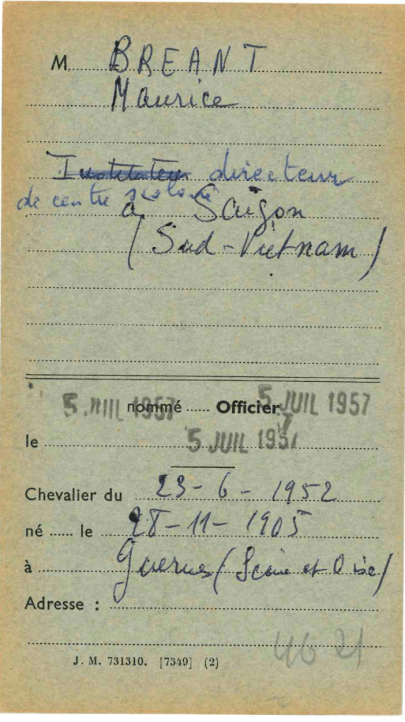 Monsieur Bréant Maurice le 05 juillet 1957, chevalier du 23 juin 1952