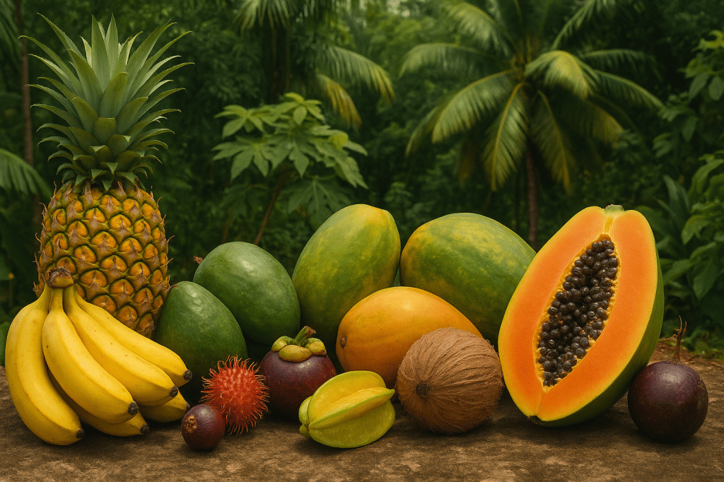 Les papayes, connues aussi sous le nom de « melons des tropiques », forment des grappes de fruits de taille et de forme variables. En effet, elles peuvent être arrondies ou très allongées, mesurer de 15 à 60 centimètres de long et peser de 300 grammes à… 10 kilos ! Mais ces géantes ne sont pas importées en Europe.