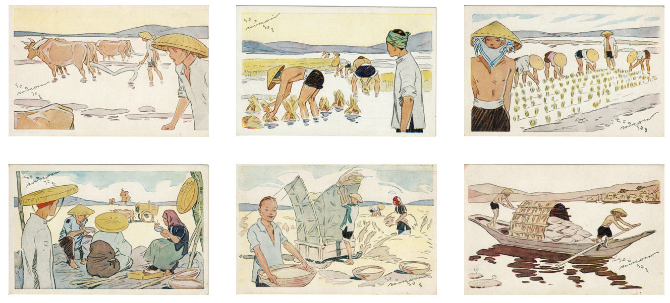 L’agriculture traditionnelle du Tonkin est principalement centrée sur la culture du riz, qui constitue l’aliment de base de la population locale. Cultivé essentiellement dans les rizières inondées des terres basses du delta du fleuve Rouge, le riz dépend fortement des conditions climatiques et d’une irrigation soigneusement contrôlée. Le cycle de culture suit un rythme saisonnier strict, comprenant des périodes de semis, de repiquage, et de récolte.